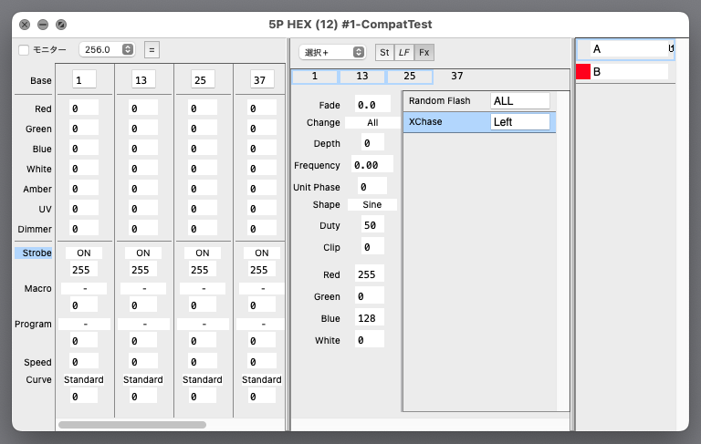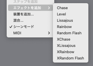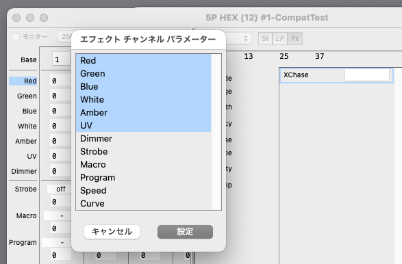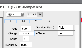 上図の例では2番目のエフェクト「XChase」の、シーン「A」での設定を表示しています。