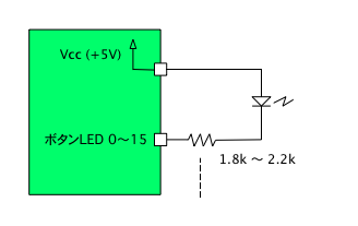 ボタン入力は、押されたときに 0V になるように接続します(アクティブロー)。