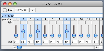 書式 <チャンネル指定> / <値> <チャンネル指定> チャンネル番号を指定します。 マイナス記号( - )で連続する範囲を指定できます。 スペースまたはピリオド( . )で区切って、不連続に複数指定できます。 (注:実際にはスペースおよびピリオド以外の記号でも区切れますが、将来の互換性のため、他の記号は使用しないで下さい) <値> 「パーセント表示」が使用されている場合は 0 ~ 100 です。 そうでない場合は 0 ~ 255 です。 いずれの場合でも、アスタリスク( * )、「 f 」あるいは「 ff 」(大文字でも可)で最大値になります。 「+」あるいは「-」を前置すると、現在の値から相対的に変更します。 <値>を指定しない場合はチャンネルを選択するだけです。 <チャンネル指定>がない場合(「 / 」と<値>だけ)は、現在選択されているチャンネルの値を変更します。 |