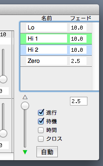 本来の「増加フェード時間」だけを使用します。 簡易モードを切り替えても、減少フェード時間およびディレイ時間のデータは保持されています。 簡易モード中にフェード時間を変更すると、減少フェード時間のデータも同じ値に設定されます。 簡易モードの時に JASCII フォーマット保存すると、ディレイ時間および減少フェード時間は保存されません(見た目の動作と同様)。 |