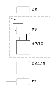 ひとつのレイヤー内には複数の「取り口」フィルターを置くことができます。 レイヤー内では上から下へ向かって順に処理されるので、その都度「一時的な画像」は置換えられます。 使用する位置よりも上側に「取り口」フィルターがある場合、フィードバック効果は得られません。 「取り口」を使用している画像入力のフィルターとして「取り口」を挿入した場合、入力が何もないので、継続的なフィードバック効果はありません。 下図の例では、「合成」フィルターの「背景」画像入力のフィルターとして「取り口」が置かれ、それを「背景」画像入力に使用しようとしています。 下図の例では、レイヤーとしての「合成」コンポジションの「背景」画像入力のフィルターとして「取り口」が置かれ、それを「背景」画像入力に使用しようとしています。 下図のように、レイヤーのフィルター(横線の下)として「取り口」を置けば、フィードバック効果を得られます。 |